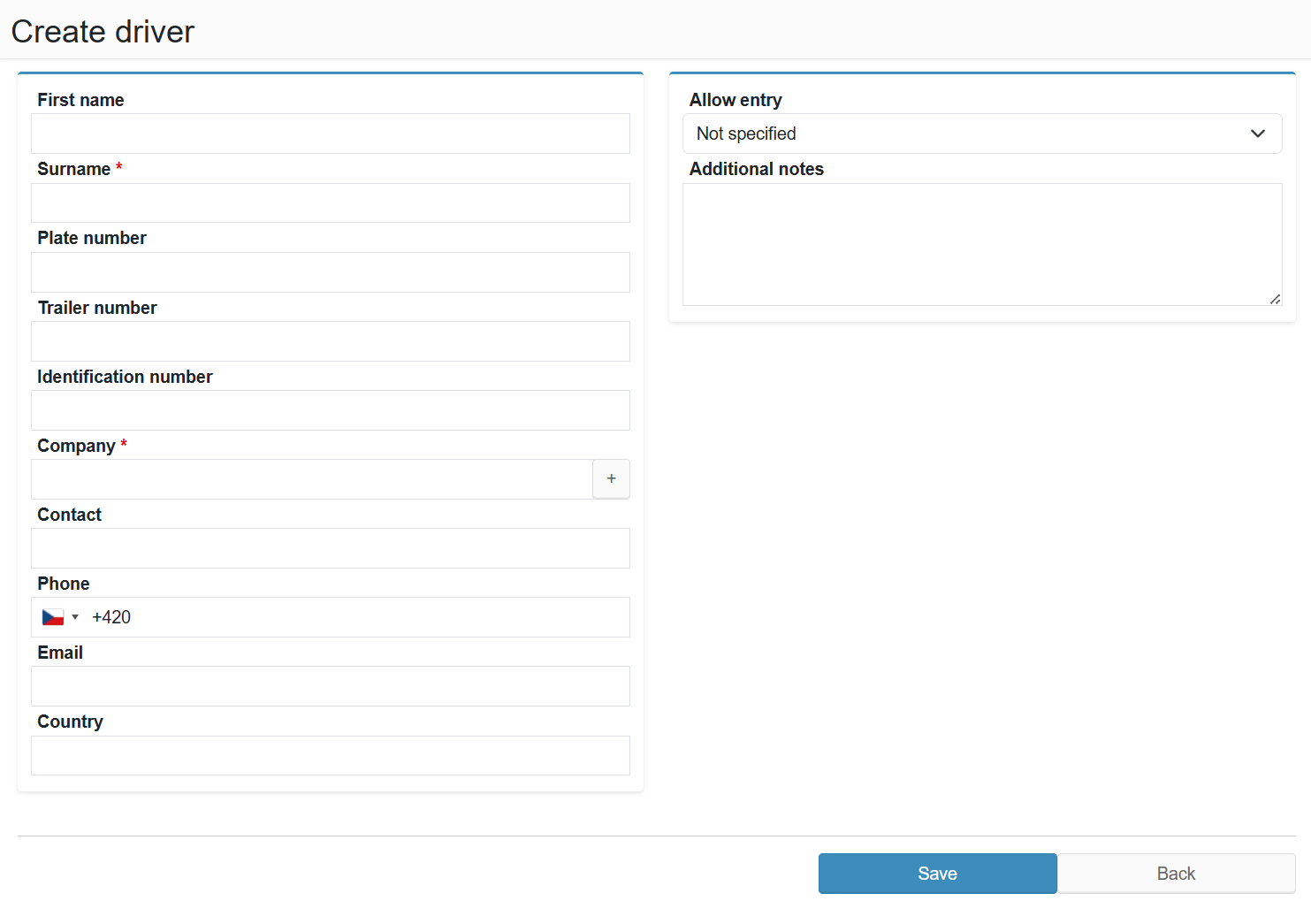 The form is used to create a new driver record and assign a vehicle licence plate to a specific company.