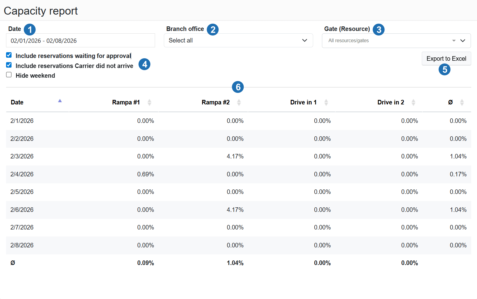 The capacity report tracks the average occupancy (utilisation) of individual resources over a selected period. It helps identify unused capacity, overloaded docks, and optimise logistics operations planning. Use it when planning capacity or identifying bottleneck docks.