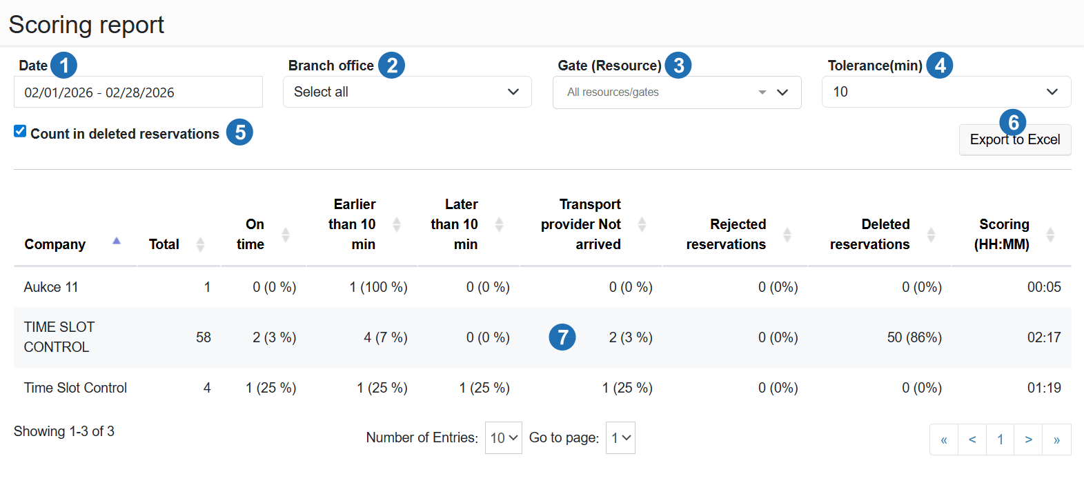 The scoring report evaluates missed planned arrival times by individual carriers over a selected period. It allows monitoring of delay rates and carrier reliability when arriving at time slots. Suitable for carrier reliability assessment and punctuality tracking.