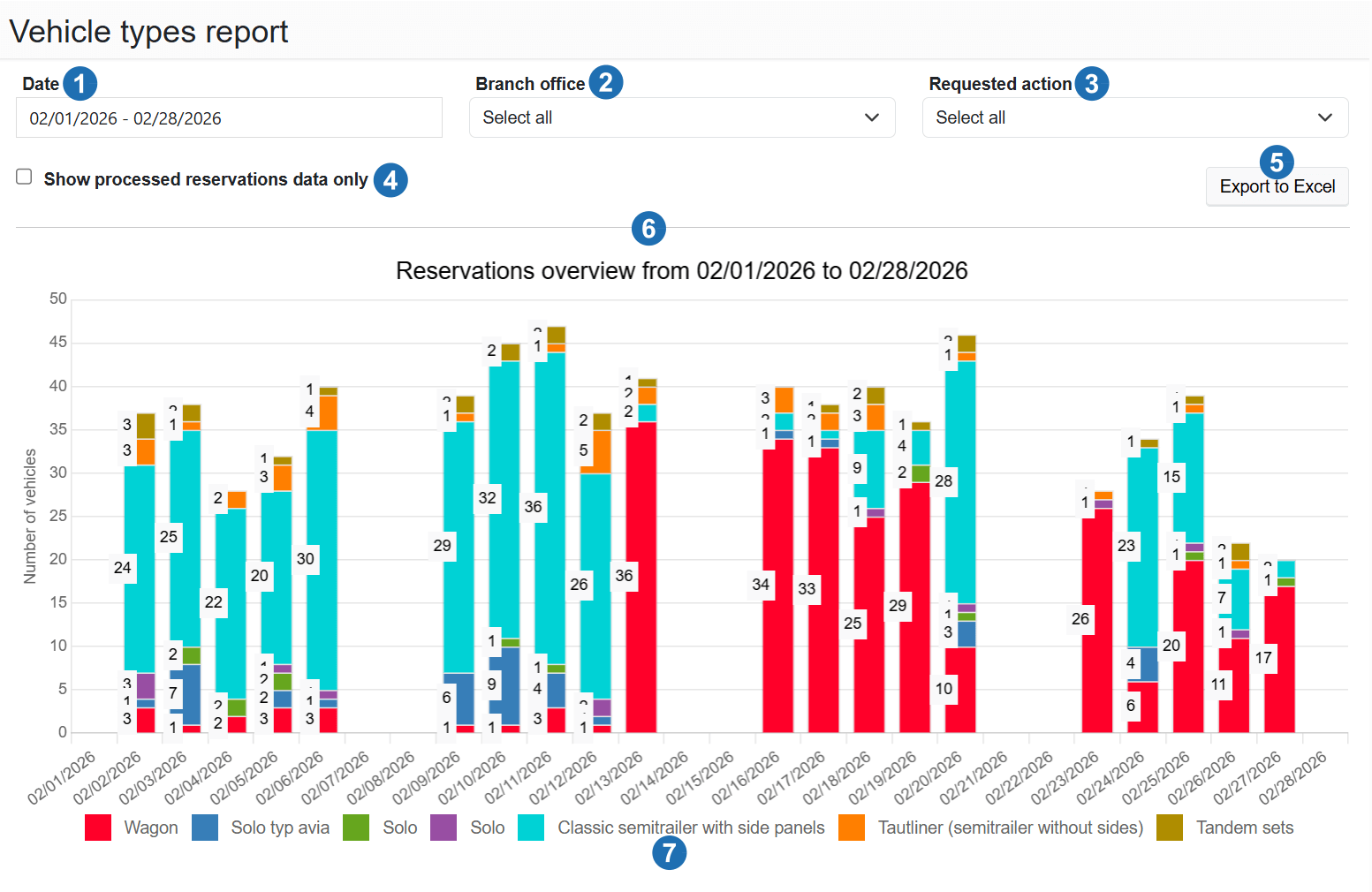 The vehicle types report provides an overview of the frequency of individual vehicle types in booked time slots over a selected period. It helps analyse transport structure, optimise dock planning, and adapt capacity to specific vehicle types. Suitable for dock optimisation or analysis of vehicle fleet composition.
