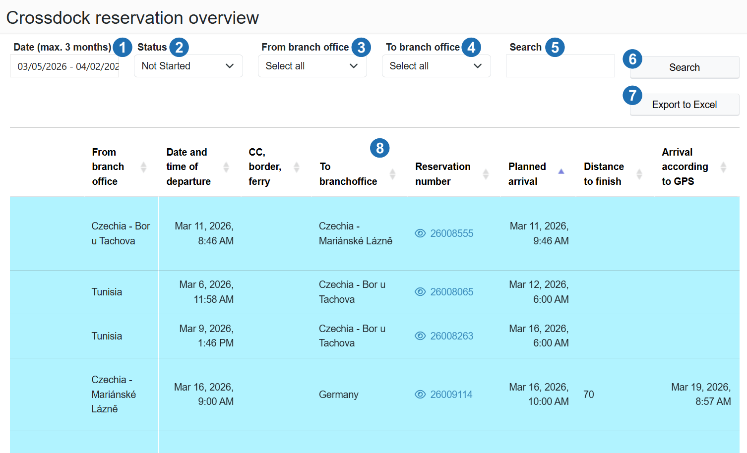 The Cross-dock section is used to view and manage cross-dock reservations between individual branches.