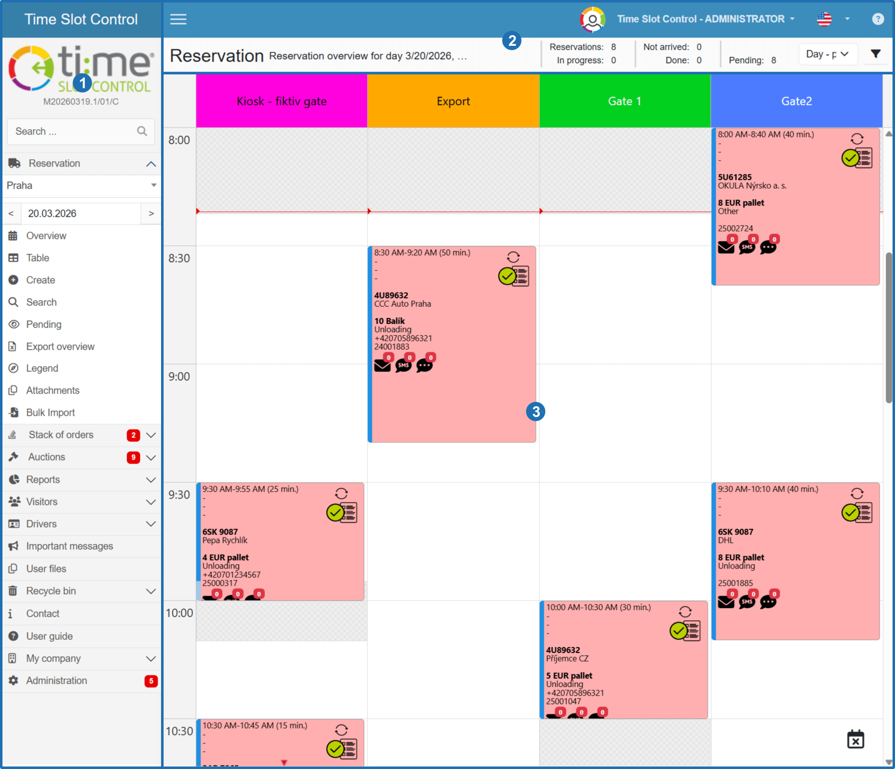 Main menu for accessing individual sections of the application (Reservations, Order Buffer, Auction, Visits, Drivers & Plates, Important Messages, User Files, Contacts)