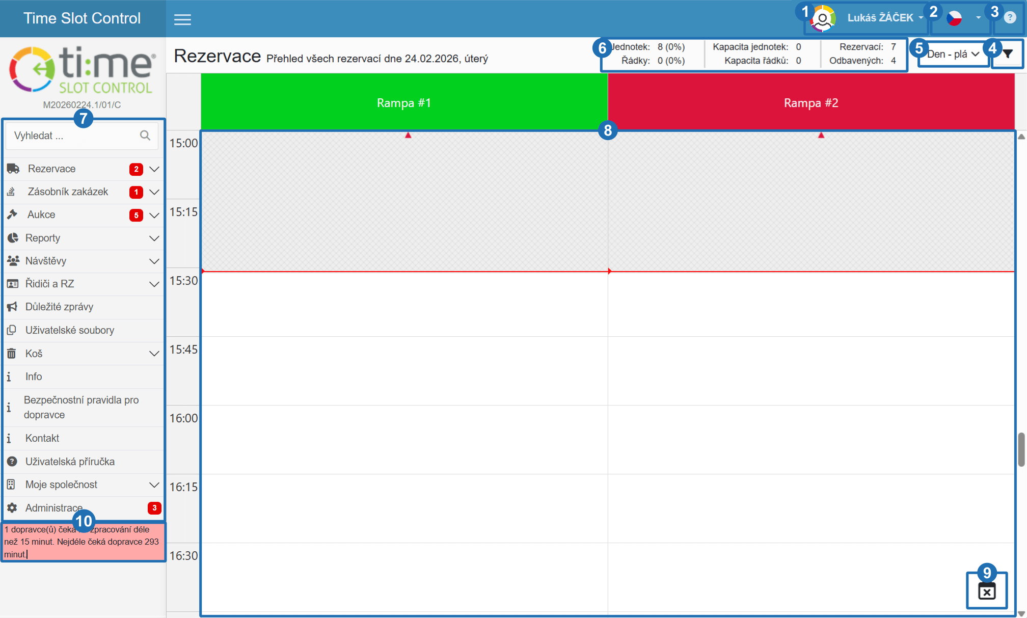 It contains controls, navigation to other sections, operational statistics and the ramp calendar for working with reservations.