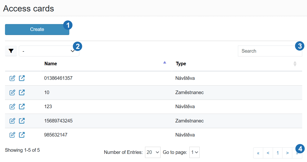 Each card can be assigned a name or identification number and a card type, for example for visitors or employees.